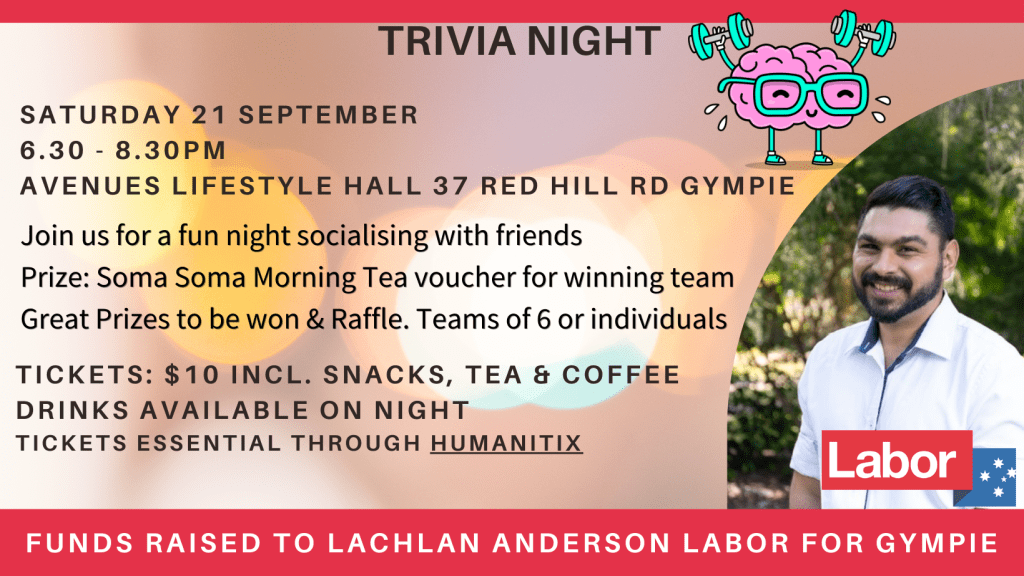 The Gympie Labor Branch and I warmly invite you to attend our fundraiser for the campaign which will be a Trivia Night with our very own Quiz Master Jo Lockwood. For more information click here.